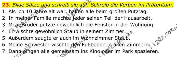 23. Bilde Sätze und schreib sie auf. Schreib die Verben im Präteritum. 1. Als ich 10 Jahre alt war, halfen alle beim großen Putztag. 2. In meiner Familie machte jeder seinen Teil der Hausarbeit. 3. Mein Bruder putzte gewöhnlich die Fenster in der Wohnung. 4. Er wischte gewöhnlich Staub in seinem Zimmer. 5. Außerdem saugte er auch im Wohnzimmer Staub. 6. Meine Schwester wischte den Fußboden in allen Zimmern. 7. Dann gingen alle gemeinsam ins Kino oder im Park spazieren.