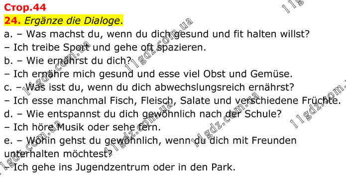 24. Ergänze die Dialoge. a. – Was machst du, wenn du dich gesund und fit halten willst? – Ich treibe Sport und gehe oft spazieren. b. – Wie ernährst du dich? – Ich ernähre mich gesund und esse viel Obst und Gemüse. c. – Was isst du, wenn du dich abwechslungsreich ernährst? – Ich esse manchmal Fisch, Fleisch, Salate und verschiedene Früchte. d. – Wie entspannst du dich gewöhnlich nach der Schule? – Ich höre Musik oder sehe fern. e. – Wohin gehst du gewöhnlich, wenn du dich mit Freunden unterhalten möchtest? – Ich gehe ins Jugendzentrum oder in den Park.