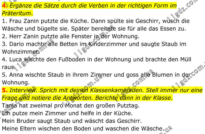 4. Ergänze die Sätze durch die Verben in der richtigen Form im Präteritum. 1. Frau Zanin putzte die Küche. Dann spülte sie Geschirr, wusch die Wäsche und bügelte sie. Später bereitete sie für alle das Essen zu. 2. Herr Zanin putzte alle Fenster in der Wohnung. 3. Dario machte alle Betten im Kinderzimmer und saugte Staub im Wohnzimmer. 4. Luca wischte den Fußboden in der Wohnung und brachte den Müll raus. 5. Anna wischte Staub in ihrem Zimmer und goss alle Blumen in der Wohnung. 5. Interview. Sprich mit deinen Klassenkameraden. Stell immer nur eine Frage und notiere die Antworten. Berichte dann in der Klasse. Tanja hat zweimal pro Monat den großen Putztag. Ich putze mein Zimmer und helfe in der Küche. Mein Bruder saugt Staub und wäscht das Geschirr. Meine Eltern wischen den Boden und waschen die Wäsche.