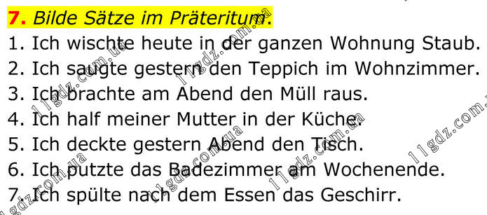 7. Bilde Sätze im Präteritum. 1. Ich wischte heute in der ganzen Wohnung Staub. 2. Ich saugte gestern den Teppich im Wohnzimmer. 3. Ich brachte am Abend den Müll raus. 4. Ich half meiner Mutter in der Küche. 5. Ich deckte gestern Abend den Tisch. 6. Ich putzte das Badezimmer am Wochenende. 7. Ich spülte nach dem Essen das Geschirr.