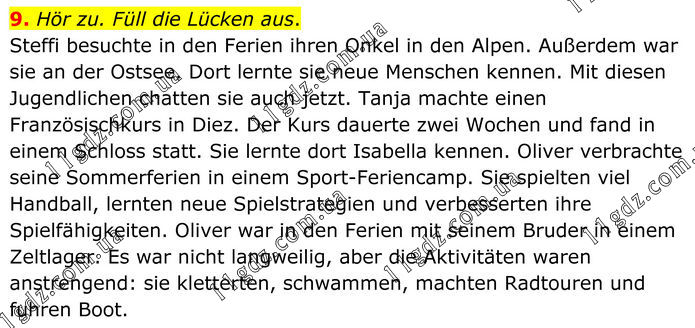 9. Hör zu. Füll die Lücken aus. Steffi besuchte in den Ferien ihren Onkel in den Alpen. Außerdem war sie an der Ostsee. Dort lernte sie neue Menschen kennen. Mit diesen Jugendlichen chatten sie auch jetzt. Tanja machte einen Französischkurs in Diez. Der Kurs dauerte zwei Wochen und fand in einem Schloss statt. Sie lernte dort Isabella kennen. Oliver verbrachte seine Sommerferien in einem Sport–Feriencamp. Sie spielten viel Handball, lernten neue Spielstrategien und verbesserten ihre Spielfähigkeiten. Oliver war in den Ferien mit seinem Bruder in einem Zeltlager. Es war nicht langweilig, aber die Aktivitäten waren anstrengend: sie kletterten, schwammen, machten Radtouren und fuhren Boot.