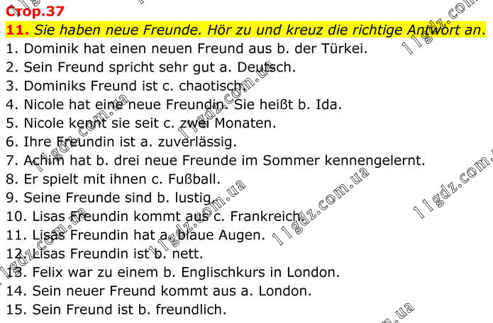11. Sie haben neue Freunde. Hör zu und kreuz die richtige Antwort an. 1. Dominik hat einen neuen Freund aus b. der Türkei. 2. Sein Freund spricht sehr gut a. Deutsch. 3. Dominiks Freund ist c. chaotisch. 4. Nicole hat eine neue Freundin. Sie heißt b. Ida. 5. Nicole kennt sie seit c. zwei Monaten. 6. Ihre Freundin ist a. zuverlässig. 7. Achim hat b. drei neue Freunde im Sommer kennengelernt. 8. Er spielt mit ihnen c. Fußball. 9. Seine Freunde sind b. lustig. 10. Lisas Freundin kommt aus c. Frankreich. 11. Lisas Freundin hat a. blaue Augen. 12. Lisas Freundin ist b. nett. 13. Felix war zu einem b. Englischkurs in London. 14. Sein neuer Freund kommt aus a. London. 15. Sein Freund ist b. freundlich.