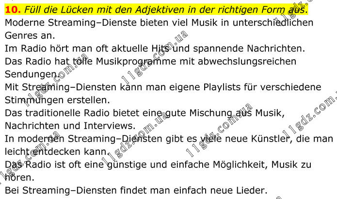 10. Füll die Lücken mit den Adjektiven in der richtigen Form aus. Moderne Streaming–Dienste bieten viel Musik in unterschiedlichen Genres an. Im Radio hört man oft aktuelle Hits und spannende Nachrichten. Das Radio hat tolle Musikprogramme mit abwechslungsreichen Sendungen. Mit Streaming–Diensten kann man eigene Playlists für verschiedene Stimmungen erstellen. Das traditionelle Radio bietet eine gute Mischung aus Musik, Nachrichten und Interviews. In modernen Streaming–Diensten gibt es viele neue Künstler, die man leicht entdecken kann. Das Radio ist oft eine günstige und einfache Möglichkeit, Musik zu hören. Bei Streaming–Diensten findet man einfach neue Lieder.