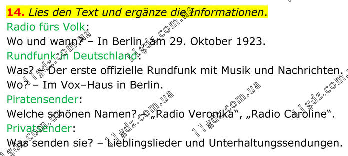 14. Lies den Text und ergänze die Informationen. Radio fürs Volk: Wo und wann? – In Berlin, am 29. Oktober 1923. Rundfunk in Deutschland: Was? – Der erste offizielle Rundfunk mit Musik und Nachrichten. Wo? – Im Vox–Haus in Berlin. Piratensender: Welche schönen Namen? – „Radio Veronika“, „Radio Caroline“. Privatsender: Was senden sie? – Lieblingslieder und Unterhaltungssendungen.