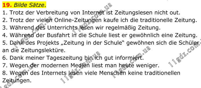 19. Bilde Sätze. 1. Trotz der Verbreitung von Internet ist Zeitungslesen nicht out. 2. Trotz der vielen Online-Zeitungen kaufe ich die traditionelle Zeitung. 3. Während des Unterrichts lesen wir regelmäßig Zeitung. 4. Während der Busfahrt in die Schule liest er gewöhnlich eine Zeitung. 5. Dank des Projekts „Zeitung in der Schule“ gewöhnen sich die Schüler an die Zeitungslektüre. 6. Dank meiner Tageszeitung bin ich gut informiert. 7. Wegen der modernen Medien liest man heute weniger. 8. Wegen des Internets lesen viele Menschen keine traditionellen Zeitungen.