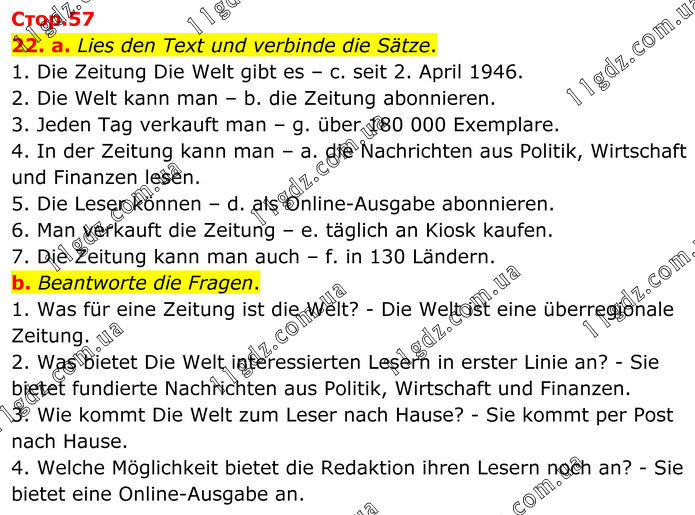 22. a. Lies den Text und verbinde die Sätze. 1. Die Zeitung Die Welt gibt es – c. seit 2. April 1946. 2. Die Welt kann man – b. die Zeitung abonnieren. 3. Jeden Tag verkauft man – g. über 180 000 Exemplare. 4. In der Zeitung kann man – a. die Nachrichten aus Politik, Wirtschaft und Finanzen lesen. 5. Die Leser können – d. als Online-Ausgabe abonnieren. 6. Man verkauft die Zeitung – e. täglich an Kiosk kaufen. 7. Die Zeitung kann man auch – f. in 130 Ländern. b. Beantworte die Fragen. 1. Was für eine Zeitung ist die Welt? - Die Welt ist eine überregionale Zeitung. 2. Was bietet Die Welt interessierten Lesern in erster Linie an? - Sie bietet fundierte Nachrichten aus Politik, Wirtschaft und Finanzen. 3. Wie kommt Die Welt zum Leser nach Hause? - Sie kommt per Post nach Hause. 4. Welche Möglichkeit bietet die Redaktion ihren Lesern noch an? - Sie bietet eine Online-Ausgabe an.