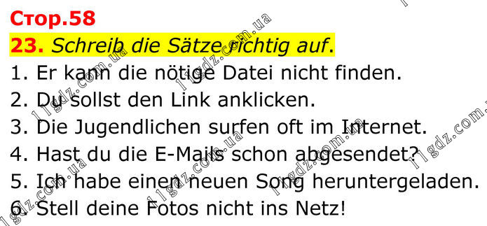 23. Schreib die Sätze richtig auf. 1. Er kann die nötige Datei nicht finden. 2. Du sollst den Link anklicken. 3. Die Jugendlichen surfen oft im Internet. 4. Hast du die E-Mails schon abgesendet? 5. Ich habe einen neuen Song heruntergeladen. 6. Stell deine Fotos nicht ins Netz!