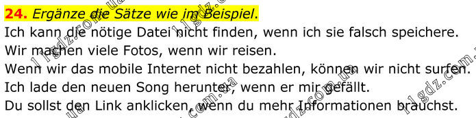 24. Ergänze die Sätze wie im Beispiel. Ich kann die nötige Datei nicht finden, wenn ich sie falsch speichere. Wir machen viele Fotos, wenn wir reisen. Wenn wir das mobile Internet nicht bezahlen, können wir nicht surfen. Ich lade den neuen Song herunter, wenn er mir gefällt. Du sollst den Link anklicken, wenn du mehr Informationen brauchst.