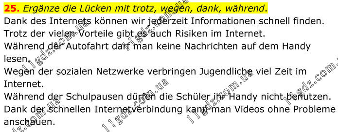 25. Ergänze die Lücken mit trotz, wegen, dank, während. Dank des Internets können wir jederzeit Informationen schnell finden. Trotz der vielen Vorteile gibt es auch Risiken im Internet. Während der Autofahrt darf man keine Nachrichten auf dem Handy lesen. Wegen der sozialen Netzwerke verbringen Jugendliche viel Zeit im Internet. Während der Schulpausen dürfen die Schüler ihr Handy nicht benutzen. Dank der schnellen Internetverbindung kann man Videos ohne Probleme anschauen.