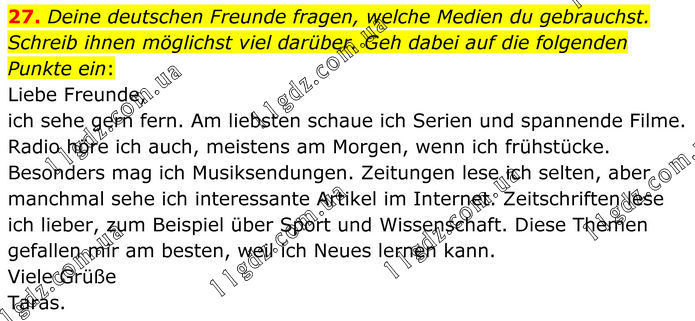 27. Deine deutschen Freunde fragen, welche Medien du gebrauchst. Schreib ihnen möglichst viel darüber. Geh dabei auf die folgenden Punkte ein: Liebe Freunde, ich sehe gern fern. Am liebsten schaue ich Serien und spannende Filme. Radio höre ich auch, meistens am Morgen, wenn ich frühstücke. Besonders mag ich Musiksendungen. Zeitungen lese ich selten, aber manchmal sehe ich interessante Artikel im Internet. Zeitschriften lese ich lieber, zum Beispiel über Sport und Wissenschaft. Diese Themen gefallen mir am besten, weil ich Neues lernen kann. Viele Grüße Taras.