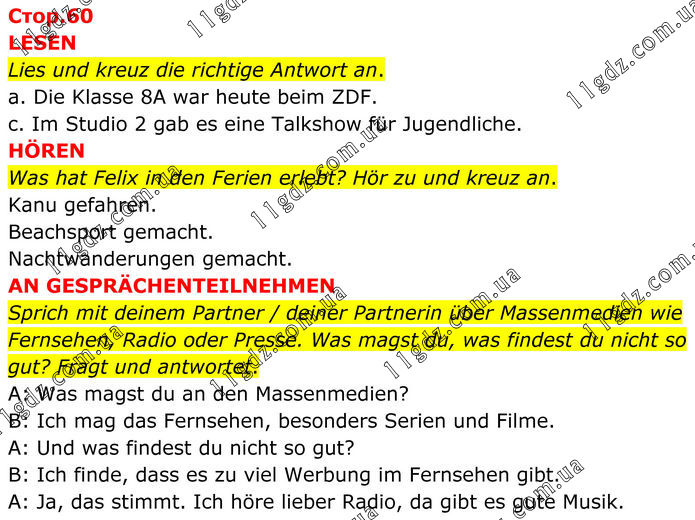 LESEN Lies und kreuz die richtige Antwort an. a. Die Klasse 8A war heute beim ZDF. c. Im Studio 2 gab es eine Talkshow für Jugendliche. HÖREN Was hat Felix in den Ferien erlebt? Hör zu und kreuz an. Kanu gefahren. Beachsport gemacht. Nachtwanderungen gemacht. AN GESPRÄCHENTEILNEHMEN Sprich mit deinem Partner / deiner Partnerin über Massenmedien wie Fernsehen, Radio oder Presse. Was magst du, was findest du nicht so gut? Fragt und antwortet. A: Was magst du an den Massenmedien? B: Ich mag das Fernsehen, besonders Serien und Filme. A: Und was findest du nicht so gut? B: Ich finde, dass es zu viel Werbung im Fernsehen gibt. A: Ja, das stimmt. Ich höre lieber Radio, da gibt es gute Musik.