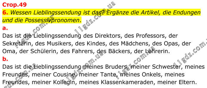 6. Wessen Lieblingssendung ist das? Ergänze die Artikel, die Endungen und die Possessivpronomen. a. Das ist die Lieblingssendung des Direktors, des Professors, der Sekretärin, des Musikers, des Kindes, des Mädchens, des Opas, der Oma, der Schülerin, des Fahrers, des Bäckers, der Lehrerin. b. Das ist die Lieblingssendung meines Bruders, meiner Schwester, meines Freundes, meiner Cousine, meiner Tante, meines Onkels, meines Freundes, meiner Kollegin, meines Klassenkameraden, meiner Eltern.