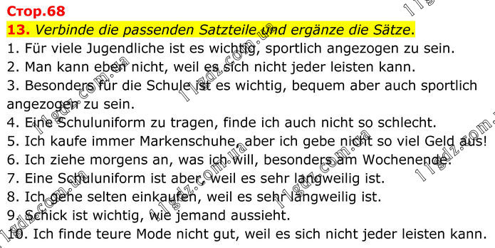 13. Verbinde die passenden Satzteile und ergänze die Sätze. 1. Für viele Jugendliche ist es wichtig, sportlich angezogen zu sein. 2. Man kann eben nicht, weil es sich nicht jeder leisten kann. 3. Besonders für die Schule ist es wichtig, bequem aber auch sportlich angezogen zu sein. 4. Eine Schuluniform zu tragen, finde ich auch nicht so schlecht. 5. Ich kaufe immer Markenschuhe, aber ich gebe nicht so viel Geld aus! 6. Ich ziehe morgens an, was ich will, besonders am Wochenende. 7. Eine Schuluniform ist aber, weil es sehr langweilig ist. 8. Ich gehe selten einkaufen, weil es sehr langweilig ist. 9. Schick ist wichtig, wie jemand aussieht. 10. Ich finde teure Mode nicht gut, weil es sich nicht jeder leisten kann.