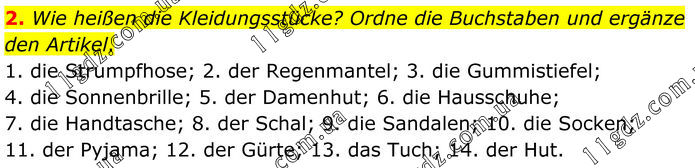 2. Wie heißen die Kleidungsstücke? Ordne die Buchstaben und ergänze den Artikel. 1. die Strumpfhose; 2. der Regenmantel; 3. die Gummistiefel; 4. die Sonnenbrille; 5. der Damenhut; 6. die Hausschuhe; 7. die Handtasche; 8. der Schal; 9. die Sandalen; 10. die Socken; 11. der Pyjama; 12. der Gürte; 13. das Tuch; 14. der Hut.