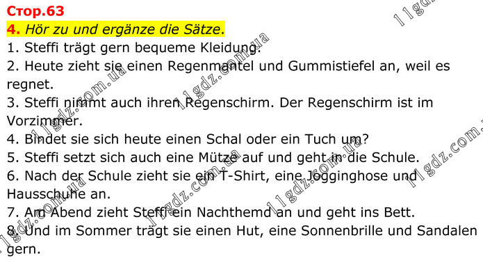 4. Hör zu und ergänze die Sätze. 1. Steffi trägt gern bequeme Kleidung. 2. Heute zieht sie einen Regenmantel und Gummistiefel an, weil es regnet. 3. Steffi nimmt auch ihren Regenschirm. Der Regenschirm ist im Vorzimmer. 4. Bindet sie sich heute einen Schal oder ein Tuch um? 5. Steffi setzt sich auch eine Mütze auf und geht in die Schule. 6. Nach der Schule zieht sie ein T-Shirt, eine Jogginghose und Hausschuhe an. 7. Am Abend zieht Steffi ein Nachthemd an und geht ins Bett. 8. Und im Sommer trägt sie einen Hut, eine Sonnenbrille und Sandalen gern.