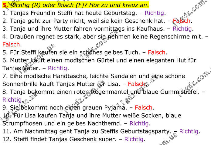 5. Richtig (R) oder falsch (F)? Hör zu und kreuz an. 1. Tanjas Freundin Steffi hat heute Geburtstag. – Richtig. 2. Tanja geht zur Party nicht, weil sie kein Geschenk hat. – Falsch. 3. Tanja und ihre Mutter fahren vormittags ins Kaufhaus. – Richtig. 4. Draußen regnet es stark, aber sie nehmen keine Regenschirme mit. – Falsch. 5. Für Steffi kaufen sie ein schönes gelbes Tuch. – Falsch. 6. Mutter kauft einen modischen Gürtel und einen eleganten Hut für Tanjas Vater. – Richtig. 7. Eine modische Handtasche, leichte Sandalen und eine schöne Sonnenbrille kauft Tanjas Mutter für Lisa. – Falsch. 8. Tanja bekommt einen roten Regenmantel und blaue Gummistiefel. – Richtig. 9. Sie bekommt noch einen grauen Pyjama. – Falsch. 10. Für Lisa kaufen Tanja und ihre Mutter weiße Socken, blaue Strumpfhosen und ein gelbes Nachthemd. – Richtig. 11. Am Nachmittag geht Tanja zu Steffis Geburtstagsparty. – Richtig. 12. Steffi findet Tanjas Geschenk super. – Richtig.