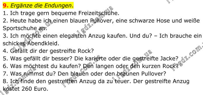 9. Ergänze die Endungen. 1. Ich trage gern bequeme Freizeitschuhe. 2. Heute habe ich einen blauen Pullover, eine schwarze Hose und weiße Sportschuhe an. 3. Ich möchte einen eleganten Anzug kaufen. Und du? – Ich brauche ein schickes Abendkleid. 4. Gefällt dir der gestreifte Rock? 5. Was gefällt dir besser? Die karierte oder die gestreifte Jacke? 6. Was möchtest du kaufen? Den langen oder den kurzen Rock? 7. Was nimmst du? Den blauen oder den braunen Pullover? 8. Ich finde den gestreiften Anzug da zu teuer. Der gestreifte Anzug kostet 260 Euro.