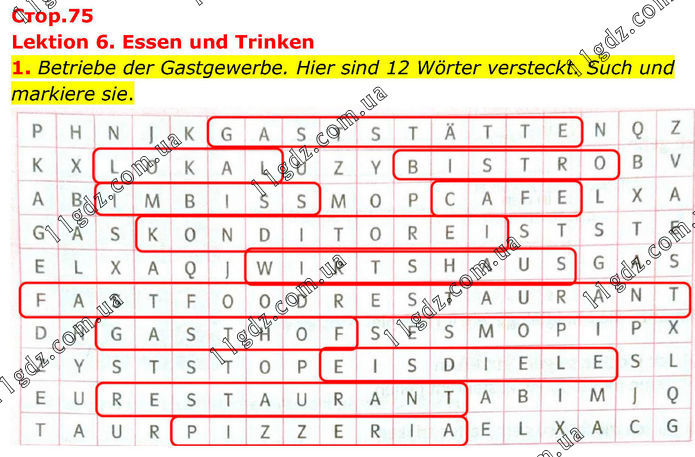 Lektion 6. Essen und Trinken 1. Betriebe der Gastgewerbe. Hier sind 12 Wörter versteckt. Such und markiere sie.