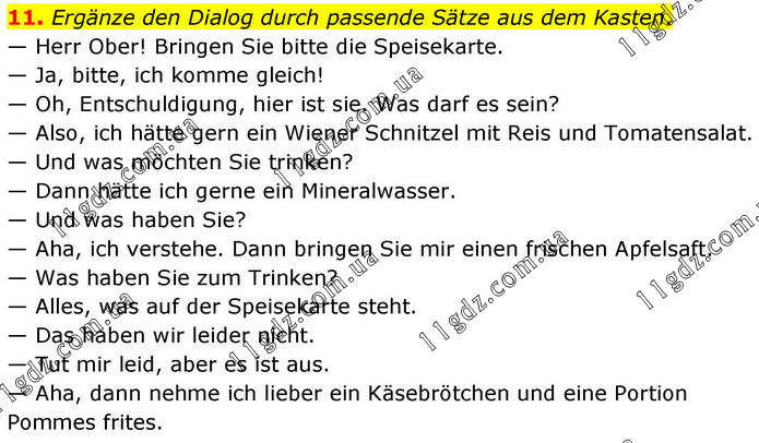 11. Ergänze den Dialog durch passende Sätze aus dem Kasten. — Herr Ober! Bringen Sie bitte die Speisekarte. — Ja, bitte, ich komme gleich! — Oh, Entschuldigung, hier ist sie. Was darf es sein? — Also, ich hätte gern ein Wiener Schnitzel mit Reis und Tomatensalat. — Und was möchten Sie trinken? — Dann hätte ich gerne ein Mineralwasser. — Und was haben Sie? — Aha, ich verstehe. Dann bringen Sie mir einen frischen Apfelsaft. — Was haben Sie zum Trinken? — Alles, was auf der Speisekarte steht. — Das haben wir leider nicht. — Tut mir leid, aber es ist aus. — Aha, dann nehme ich lieber ein Käsebrötchen und eine Portion Pommes frites.