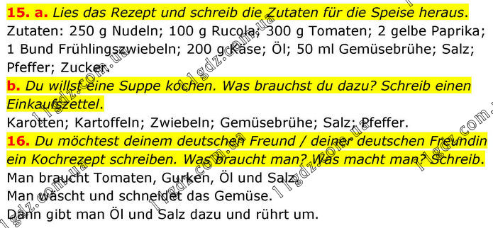 15. a. Lies das Rezept und schreib die Zutaten für die Speise heraus. Zutaten: 250 g Nudeln; 100 g Rucola; 300 g Tomaten; 2 gelbe Paprika; 1 Bund Frühlingszwiebeln; 200 g Käse; Öl; 50 ml Gemüsebrühe; Salz; Pfeffer; Zucker. b. Du willst eine Suppe kochen. Was brauchst du dazu? Schreib einen Einkaufszettel. Karotten; Kartoffeln; Zwiebeln; Gemüsebrühe; Salz; Pfeffer. 16. Du möchtest deinem deutschen Freund / deiner deutschen Freundin ein Kochrezept schreiben. Was braucht man? Was macht man? Schreib. Man braucht Tomaten, Gurken, Öl und Salz. Man wäscht und schneidet das Gemüse. Dann gibt man Öl und Salz dazu und rührt um.