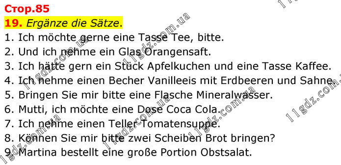 19. Ergänze die Sätze. 1. Ich möchte gerne eine Tasse Tee, bitte. 2. Und ich nehme ein Glas Orangensaft. 3. Ich hätte gern ein Stück Apfelkuchen und eine Tasse Kaffee. 4. Ich nehme einen Becher Vanilleeis mit Erdbeeren und Sahne. 5. Bringen Sie mir bitte eine Flasche Mineralwasser. 6. Mutti, ich möchte eine Dose Coca Cola. 7. Ich nehme einen Teller Tomatensuppe. 8. Können Sie mir bitte zwei Scheiben Brot bringen? 9. Martina bestellt eine große Portion Obstsalat.