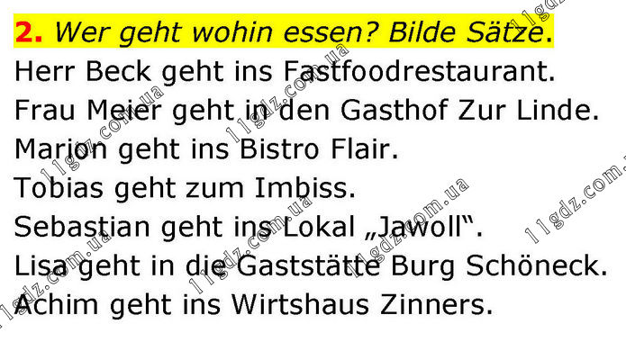 2. Wer geht wohin essen? Bilde Sätze. Herr Beck geht ins Fastfoodrestaurant. Frau Meier geht in den Gasthof Zur Linde. Marion geht ins Bistro Flair. Tobias geht zum Imbiss. Sebastian geht ins Lokal „Jawoll“. Lisa geht in die Gaststätte Burg Schöneck. Achim geht ins Wirtshaus Zinners.