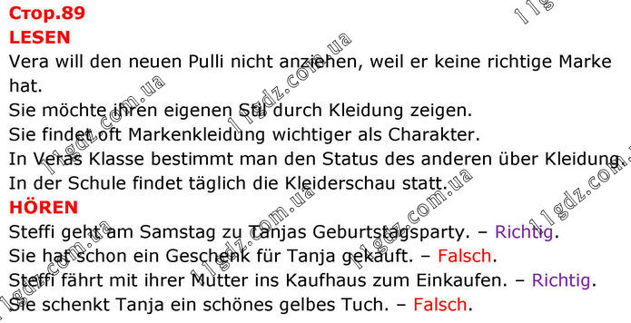 LESEN Vera will den neuen Pulli nicht anziehen, weil er keine richtige Marke hat. Sie möchte ihren eigenen Stil durch Kleidung zeigen. Sie findet oft Markenkleidung wichtiger als Charakter. In Veras Klasse bestimmt man den Status des anderen über Kleidung. In der Schule findet täglich die Kleiderschau statt. HÖREN Steffi geht am Samstag zu Tanjas Geburtstagsparty. – Richtig. Sie hat schon ein Geschenk für Tanja gekauft. – Falsch. Steffi fährt mit ihrer Mutter ins Kaufhaus zum Einkaufen. – Richtig. Sie schenkt Tanja ein schönes gelbes Tuch. – Falsch.