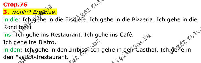 3. Wohin? Ergänze. in die: Ich gehe in die Eisdiele. Ich gehe in die Pizzeria. Ich gehe in die Konditorei. ins: Ich gehe ins Restaurant. Ich gehe ins Café. Ich gehe ins Bistro. in den: Ich gehe in den Imbiss. Ich gehe in den Gasthof. Ich gehe in den Fastfoodrestaurant.