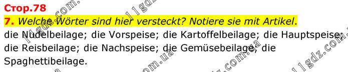 7. Welche Wörter sind hier versteckt? Notiere sie mit Artikel. die Nudelbeilage; die Vorspeise; die Kartoffelbeilage; die Hauptspeise; die Reisbeilage; die Nachspeise; die Gemüsebeilage; die Spaghettibeilage.