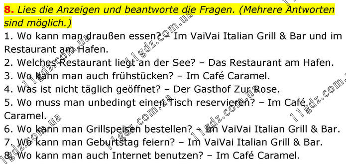 8. Lies die Anzeigen und beantworte die Fragen. (Mehrere Antworten sind möglich.) 1. Wo kann man draußen essen? – Im VaiVai Italian Grill & Bar und im Restaurant am Hafen. 2. Welches Restaurant liegt an der See? – Das Restaurant am Hafen. 3. Wo kann man auch frühstücken? – Im Café Caramel. 4. Was ist nicht täglich geöffnet? – Der Gasthof Zur Rose. 5. Wo muss man unbedingt einen Tisch reservieren? – Im Café Caramel. 6. Wo kann man Grillspeisen bestellen? – Im VaiVai Italian Grill & Bar. 7. Wo kann man Geburtstag feiern? – Im VaiVai Italian Grill & Bar. 8. Wo kann man auch Internet benutzen? – Im Café Caramel.