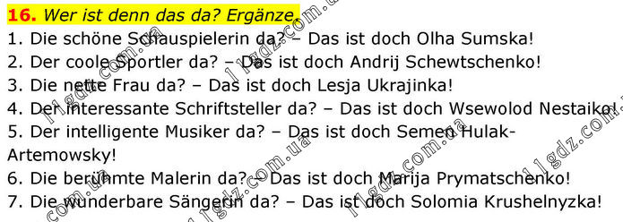 16. Wer ist denn das da? Ergänze. 1. Die schöne Schauspielerin da? – Das ist doch Olha Sumska! 2. Der coole Sportler da? – Das ist doch Andrij Schewtschenko! 3. Die nette Frau da? – Das ist doch Lesja Ukrajinka! 4. Der interessante Schriftsteller da? – Das ist doch Wsewolod Nestaiko! 5. Der intelligente Musiker da? – Das ist doch Semen Hulak-Artemowsky! 6. Die berühmte Malerin da? – Das ist doch Marija Prymatschenko! 7. Die wunderbare Sängerin da? – Das ist doch Solomia Krushelnyzka!