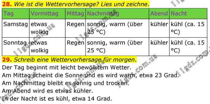 28. Wie ist die Wettervorhersage? Lies und zeichne. Tag Vormittag Mittag Nachmittag Abend Nacht Samstag etwas wolkig Regen sonnig, warm (über 25 °C) kühler kühl (ca. 15 °C) Sonntag etwas wolkig Regen sonnig, warm (über 25 °C) kühler kühl (ca. 15 °C) 29. Schreib eine Wettervorhersage für morgen. Der Tag beginnt mit leicht bewölktem Wetter. Am Mittag scheint die Sonne und es wird warm, etwa 23 Grad. Am Nachmittag bleibt es sonnig und trocken. Am Abend wird es etwas kühler. In der Nacht ist es kühl, etwa 14 Grad.