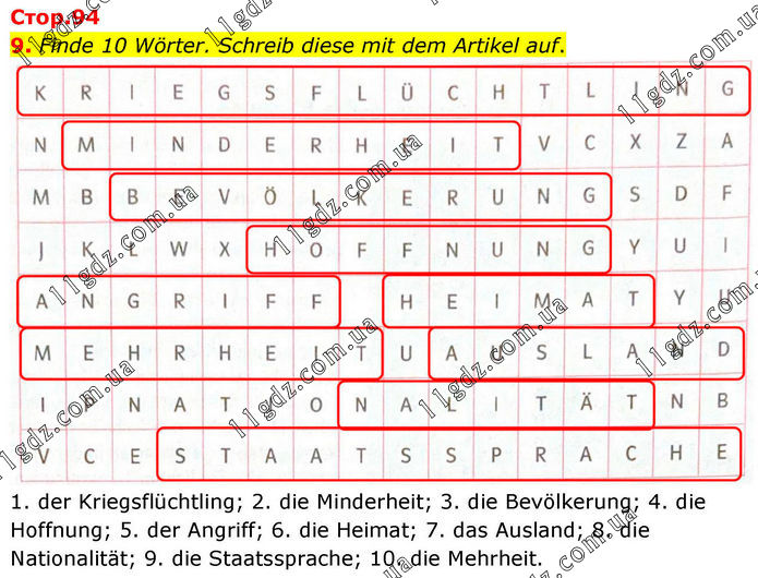 9. Finde 10 Wörter. Schreib diese mit dem Artikel auf. 1. der Kriegsflüchtling; 2. die Minderheit; 3. die Bevölkerung; 4. die Hoffnung; 5. der Angriff; 6. die Heimat; 7. das Ausland; 8. die Nationalität; 9. die Staatssprache; 10. die Mehrheit.