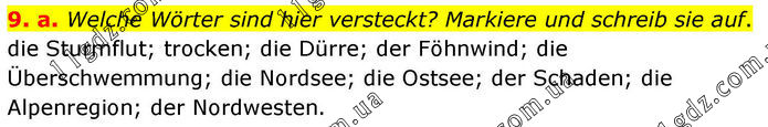 9. a. Welche Wörter sind hier versteckt? Markiere und schreib sie auf. die Sturmflut; trocken; die Dürre; der Föhnwind; die Überschwemmung; die Nordsee; die Ostsee; der Schaden; die Alpenregion; der Nordwesten.