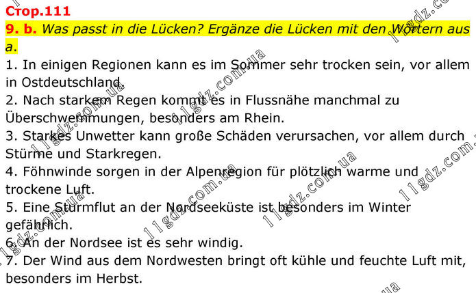 9. b. Was passt in die Lücken? Ergänze die Lücken mit den Wörtern aus a. 1. In einigen Regionen kann es im Sommer sehr trocken sein, vor allem in Ostdeutschland. 2. Nach starkem Regen kommt es in Flussnähe manchmal zu Überschwemmungen, besonders am Rhein. 3. Starkes Unwetter kann große Schäden verursachen, vor allem durch Stürme und Starkregen. 4. Föhnwinde sorgen in der Alpenregion für plötzlich warme und trockene Luft. 5. Eine Sturmflut an der Nordseeküste ist besonders im Winter gefährlich. 6. An der Nordsee ist es sehr windig. 7. Der Wind aus dem Nordwesten bringt oft kühle und feuchte Luft mit, besonders im Herbst.