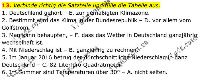 13. Verbinde richtig die Satzteile und fülle die Tabelle aus. 1. Deutschland gehört – E. zur gemäßigten Klimazone. 2. Bestimmt wird das Klima in der Bundesrepublik – D. vor allem vom Golfstrom. 3. Man kann behaupten, – F. dass das Wetter in Deutschland ganzjährig wechselhaft ist. 4. Mit Niederschlag ist – B. ganzjährig zu rechnen. 5. Im Januar 2016 betrug der durchschnittliche Niederschlag in ganz Deutschland – C. 82 Liter pro Quadratmeter. 6. Im Sommer sind Temperaturen über 30° – A. nicht selten.