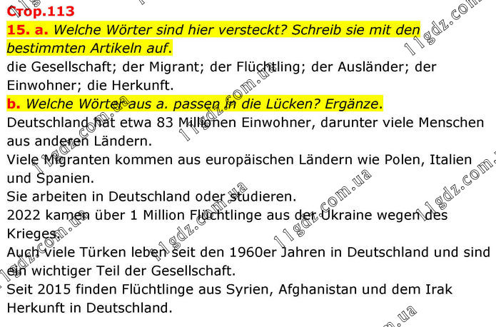 15. a. Welche Wörter sind hier versteckt? Schreib sie mit den bestimmten Artikeln auf. die Gesellschaft; der Migrant; der Flüchtling; der Ausländer; der Einwohner; die Herkunft. b. Welche Wörter aus a. passen in die Lücken? Ergänze. Deutschland hat etwa 83 Millionen Einwohner, darunter viele Menschen aus anderen Ländern. Viele Migranten kommen aus europäischen Ländern wie Polen, Italien und Spanien. Sie arbeiten in Deutschland oder studieren. 2022 kamen über 1 Million Flüchtlinge aus der Ukraine wegen des Krieges. Auch viele Türken leben seit den 1960er Jahren in Deutschland und sind ein wichtiger Teil der Gesellschaft. Seit 2015 finden Flüchtlinge aus Syrien, Afghanistan und dem Irak Herkunft in Deutschland.