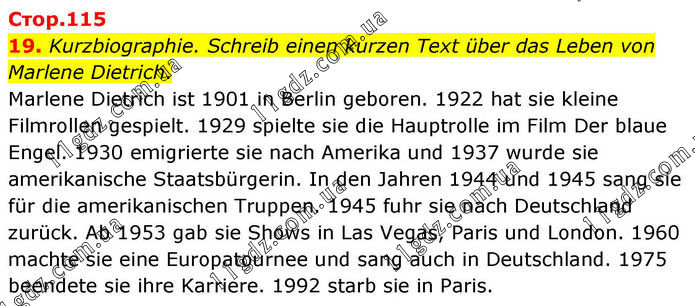 19. Kurzbiographie. Schreib einen kurzen Text über das Leben von Marlene Dietrich. Marlene Dietrich ist 1901 in Berlin geboren. 1922 hat sie kleine Filmrollen gespielt. 1929 spielte sie die Hauptrolle im Film Der blaue Engel. 1930 emigrierte sie nach Amerika und 1937 wurde sie amerikanische Staatsbürgerin. In den Jahren 1944 und 1945 sang sie für die amerikanischen Truppen. 1945 fuhr sie nach Deutschland zurück. Ab 1953 gab sie Shows in Las Vegas, Paris und London. 1960 machte sie eine Europatournee und sang auch in Deutschland. 1975 beendete sie ihre Karriere. 1992 starb sie in Paris.