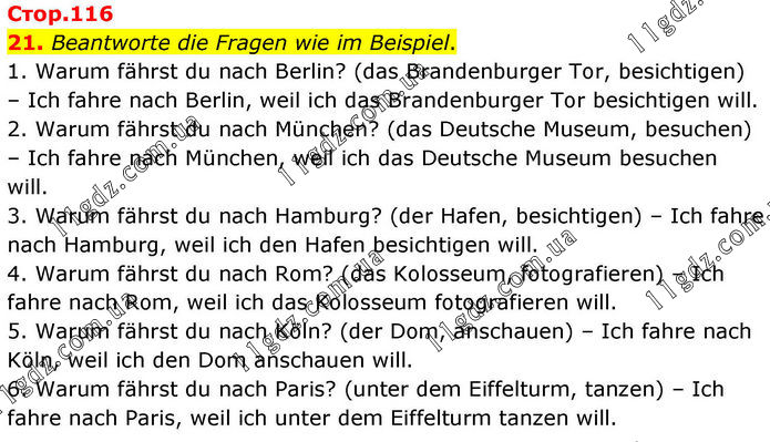 21. Beantworte die Fragen wie im Beispiel. 1. Warum fährst du nach Berlin? (das Brandenburger Tor, besichtigen) – Ich fahre nach Berlin, weil ich das Brandenburger Tor besichtigen will. 2. Warum fährst du nach München? (das Deutsche Museum, besuchen) – Ich fahre nach München, weil ich das Deutsche Museum besuchen will. 3. Warum fährst du nach Hamburg? (der Hafen, besichtigen) – Ich fahre nach Hamburg, weil ich den Hafen besichtigen will. 4. Warum fährst du nach Rom? (das Kolosseum, fotografieren) – Ich fahre nach Rom, weil ich das Kolosseum fotografieren will. 5. Warum fährst du nach Köln? (der Dom, anschauen) – Ich fahre nach Köln, weil ich den Dom anschauen will. 6. Warum fährst du nach Paris? (unter dem Eiffelturm, tanzen) – Ich fahre nach Paris, weil ich unter dem Eiffelturm tanzen will.