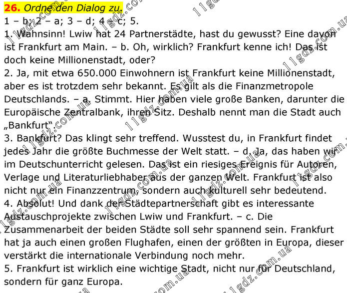 26. Ordne den Dialog zu. 1 – b; 2 – a; 3 – d; 4 – c; 5. 1. Wahnsinn! Lwiw hat 24 Partnerstädte, hast du gewusst? Eine davon ist Frankfurt am Main. – b. Oh, wirklich? Frankfurt kenne ich! Das ist doch keine Millionenstadt, oder? 2. Ja, mit etwa 650.000 Einwohnern ist Frankfurt keine Millionenstadt, aber es ist trotzdem sehr bekannt. Es gilt als die Finanzmetropole Deutschlands. – a. Stimmt. Hier haben viele große Banken, darunter die Europäische Zentralbank, ihren Sitz. Deshalb nennt man die Stadt auch „Bankfurt“. 3. Bankfurt? Das klingt sehr treffend. Wusstest du, in Frankfurt findet jedes Jahr die größte Buchmesse der Welt statt. – d. Ja, das haben wir im Deutschunterricht gelesen. Das ist ein riesiges Ereignis für Autoren, Verlage und Literaturliebhaber aus der ganzen Welt. Frankfurt ist also nicht nur ein Finanzzentrum, sondern auch kulturell sehr bedeutend. 4. Absolut! Und dank der Städtepartnerschaft gibt es interessante Austauschprojekte zwischen Lwiw und Frankfurt. – c. Die Zusammenarbeit der beiden Städte soll sehr spannend sein. Frankfurt hat ja auch einen großen Flughafen, einen der größten in Europa, dieser verstärkt die internationale Verbindung noch mehr. 5. Frankfurt ist wirklich eine wichtige Stadt, nicht nur für Deutschland, sondern für ganz Europa.