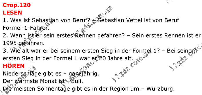 LESEN 1. Was ist Sebastian von Beruf? – Sebastian Vettel ist von Beruf Formel-1-Fahrer. 2. Wann ist er sein erstes Rennen gefahren? – Sein erstes Rennen ist er 1995 gefahren. 3. Wie alt war er bei seinem ersten Sieg in der Formel 1? – Bei seinem ersten Sieg in der Formel 1 war er 20 Jahre alt. HÖREN Niederschläge gibt es – ganzjährig. Der wärmste Monat ist – Juli. Die meisten Sonnentage gibt es in der Region um – Würzburg.