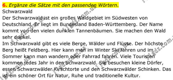 6. Ergänze die Sätze mit den passenden Wörtern. Schwarzwald Der Schwarzwald ist ein großes Waldgebiet im Südwesten von Deutschland. Er liegt im Bundesland Baden-Württemberg. Der Name kommt von den vielen dunklen Tannenbäumen. Sie machen den Wald sehr dunkel. Im Schwarzwald gibt es viele Berge, Wälder und Flüsse. Der höchste Berg heißt Feldberg. Hier kann man im Winter Ski fahren und im Sommer kann man wandern oder Fahrrad fahren. Viele Touristen kommen jedes Jahr in den Schwarzwald. Sie besuchen kleine Dörfer, essen Schwarzwälder Kirschtorte und den Schwarzwälder Schinken. Das ist ein schöner Ort für Natur, Ruhe und traditionelle Kultur.