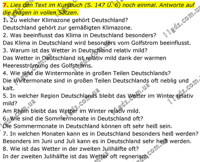 7. Lies den Text im Kursbuch (S. 147 Ü. 6) noch einmal. Antworte auf die Fragen in vollen Sätzen. 1. Zu welcher Klimazone gehört Deutschland? Deutschland gehört zur gemäßigten Klimazone. 2. Was beeinflusst das Klima in Deutschland besonders? Das Klima in Deutschland wird besonders vom Golfstrom beeinflusst. 3. Warum ist das Wetter in Deutschland relativ mild? Das Wetter in Deutschland ist relativ mild dank der warmen Meeresströmung des Golfstroms. 4. Wie sind die Wintermonate in großen Teilen Deutschlands? Die Wintermonate sind in großen Teilen Deutschlands oft neblig und kalt. 5. In welcher Region Deutschlands bleibt das Wetter im Winter relativ mild? Am Rhein bleibt das Wetter im Winter relativ mild. 6. Wie sind die Sommermonate in Deutschland oft? Die Sommermonate in Deutschland können oft sehr heiß sein. 7. In welchen Monaten kann es in Deutschland besonders heiß werden? Besonders im Juni und Juli kann es in Deutschland sehr heiß werden. 8. Wie ist das Wetter in der zweiten Julihälfte oft? In der zweiten Julihälfte ist das Wetter oft regnerisch.