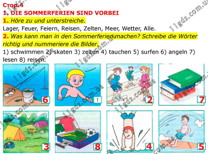 1. DIE SOMMERFERIEN SIND VORBEI 1. Höre zu und unterstreiche. Lager, Feuer, Feiern, Reisen, Zelten, Meer, Wetter, Alle. 2. Was kann man in den Sommerferien machen? Schreibe die Wörter richtig und nummeriere die Bilder. 1) schwimmen 2) skaten 3) zelten 4) tauchen 5) surfen 6) angeln 7) lesen 8) reisen.