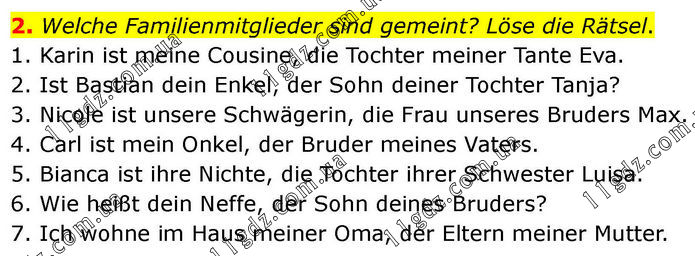 2. Welche Familienmitglieder sind gemeint? Löse die Rätsel. 1. Karin ist meine Cousine, die Tochter meiner Tante Eva. 2. Ist Bastian dein Enkel, der Sohn deiner Tochter Tanja? 3. Nicole ist unsere Schwägerin, die Frau unseres Bruders Max. 4. Carl ist mein Onkel, der Bruder meines Vaters. 5. Bianca ist ihre Nichte, die Tochter ihrer Schwester Luisa. 6. Wie heißt dein Neffe, der Sohn deines Bruders? 7. Ich wohne im Haus meiner Oma, der Eltern meiner Mutter.