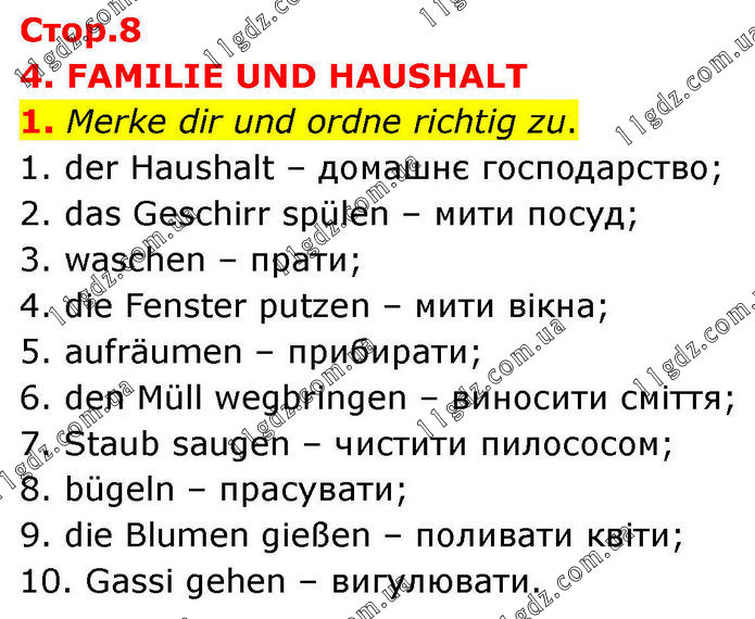 4. FAMILIE UND HAUSHALT 1. Merke dir und ordne richtig zu. 1. der Haushalt – домашнє господарство; 2. das Geschirr spülen – мити посуд; 3. waschen – прати; 4. die Fenster putzen – мити вікна; 5. aufräumen – прибирати; 6. den Müll wegbringen – виносити сміття; 7. Staub saugen – чистити пилососом; 8. bügeln – прасувати; 9. die Blumen gießen – поливати квіти; 10. Gassi gehen – вигулювати.