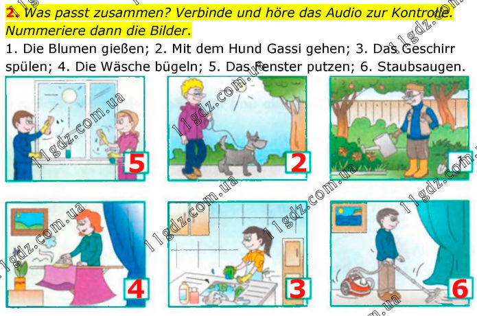 2. Was passt zusammen? Verbinde und höre das Audio zur Kontrolle. Nummeriere dann die Bilder. 1. Die Blumen gießen; 2. Mit dem Hund Gassi gehen; 3. Das Geschirr spülen; 4. Die Wäsche bügeln; 5. Das Fenster putzen; 6. Staubsaugen.