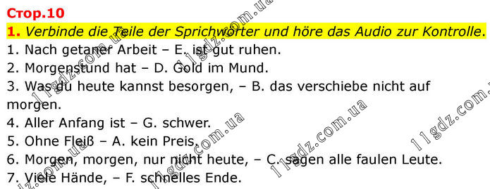 1. Verbinde die Teile der Sprichwörter und höre das Audio zur Kontrolle. 1. Nach getaner Arbeit – E. ist gut ruhen. 2. Morgenstund hat – D. Gold im Mund. 3. Was du heute kannst besorgen, – B. das verschiebe nicht auf morgen. 4. Aller Anfang ist – G. schwer. 5. Ohne Fleiß – A. kein Preis. 6. Morgen, morgen, nur nicht heute, – C. sagen alle faulen Leute. 7. Viele Hände, – F. schnelles Ende.