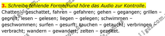 3. Schreibe fehlende Formen und höre das Audio zur Kontrolle. Chatten – geschattet, fahren – gefahren; gehen – gegangen; grillen – gegrillt; lesen – gelesen; liegen – gelegen; schwimmen – geschwommen; surfen – gesurft; tauchen – getaucht; verbringen – verbracht; wandern – gewandert; zelten – gezeltet.