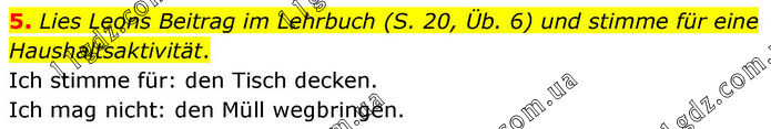 5. Lies Leons Beitrag im Lehrbuch (S. 20, Üb. 6) und stimme für eine Haushaltsaktivität. Ich stimme für: den Tisch decken. Ich mag nicht: den Müll wegbringen.